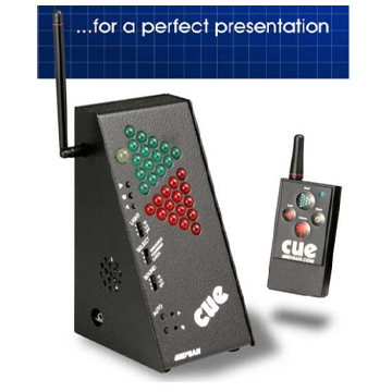 D’San Perfect Cue rental hire in Orlando Florida. This presentation tool is a light and sound signaling system that enables a speaker to send cues to a projectionist for “next”, “back” and “blank” using a wireless hand-held actuator. Each kit includes two base/receivers, two transmitter/remotes, and two AC adapters.
